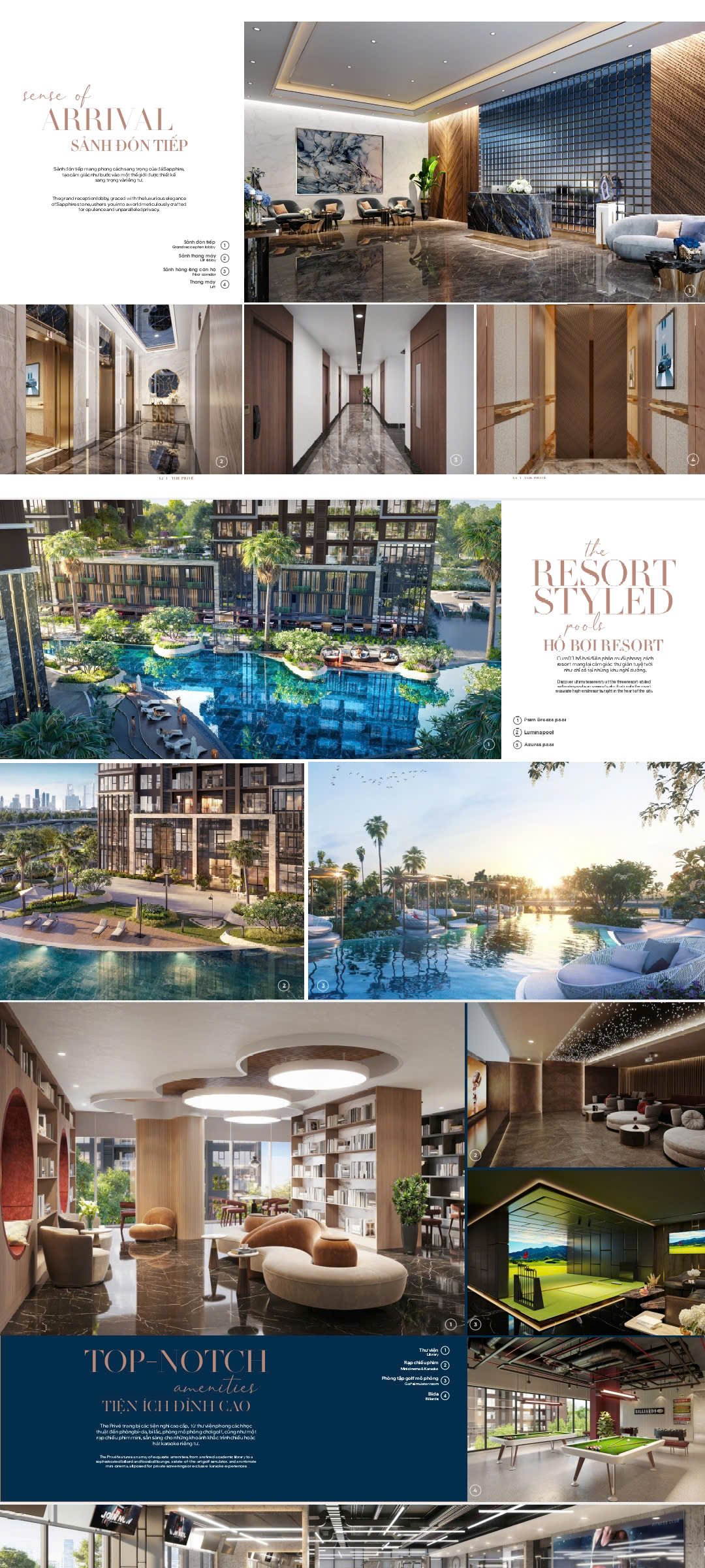 The Privé được thiết kế như một “resort tại gia”, cung cấp hơn 45 tiện ích được chọn lọc kỹ lưỡng, nâng tầm cuộc sống hàng ngày lên chuẩn 5 sao. Điểm nhấn là hồ bơi nước mặn vô cực rộng 3.300 m², uốn lượn giữa các tòa tháp như một dòng sông lấp lánh, cùng với công viên ven sông dài 1 km. Cư dân có thể tận hưởng bến du thuyền riêng, một tiện ích hiếm có trong môi trường đô thị, cùng với các khu vườn trên cao, sân golf 3D và các phòng ăn sang trọng lấy cảm hứng từ ẩm thực toàn cầu.
