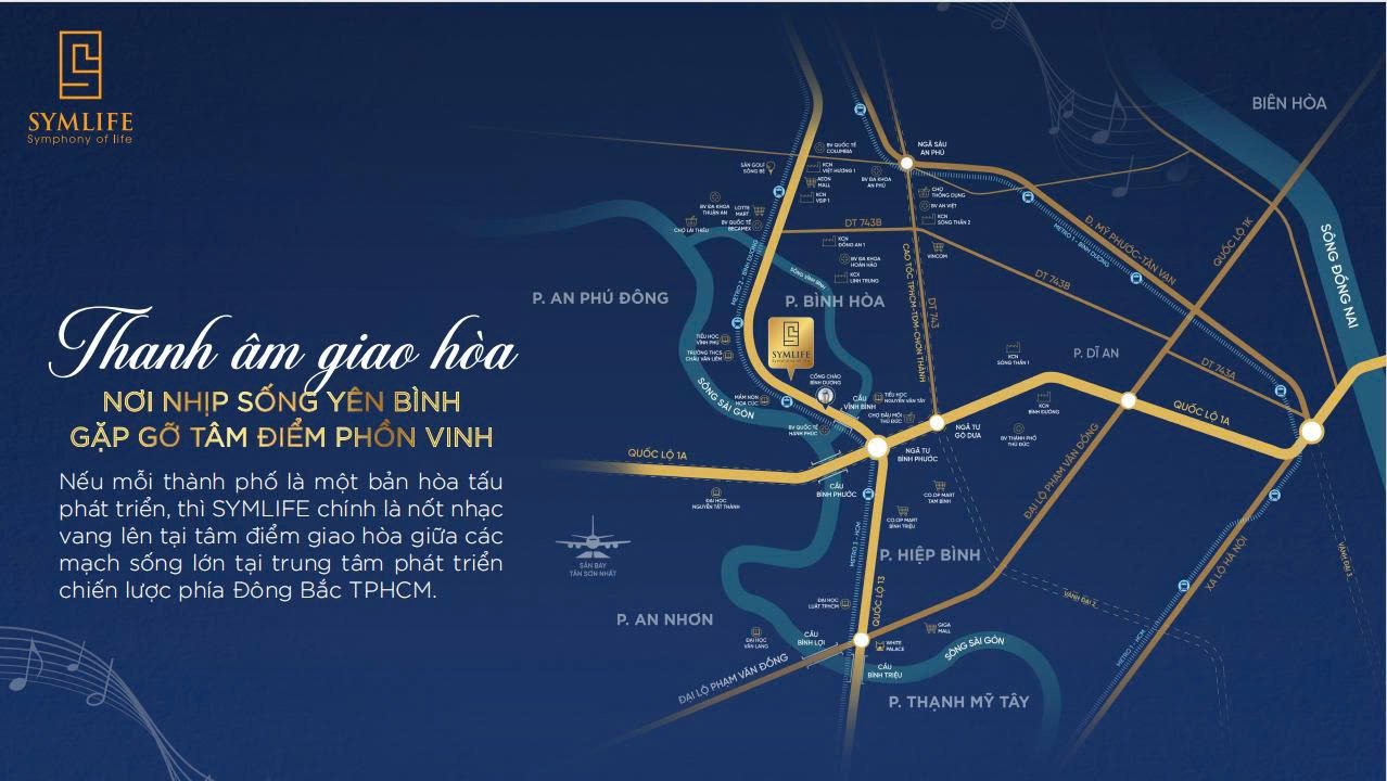 Toạ lạc giữa sông Sài Gòn và sông Câu Mống, ngay mặt tiền đường Quốc lộ 13 - SYMLIFE sở hữu: 4 mặt view sông đã tạo nên một bản hòa tấu hoàn hảo giữa thiên nhiên, kết nối và tầm nhìn dài hạn dành cho những nhà đầu tư thức thời hay chỉ đơn giản là đang tìm kiếm một chốn về an yên.